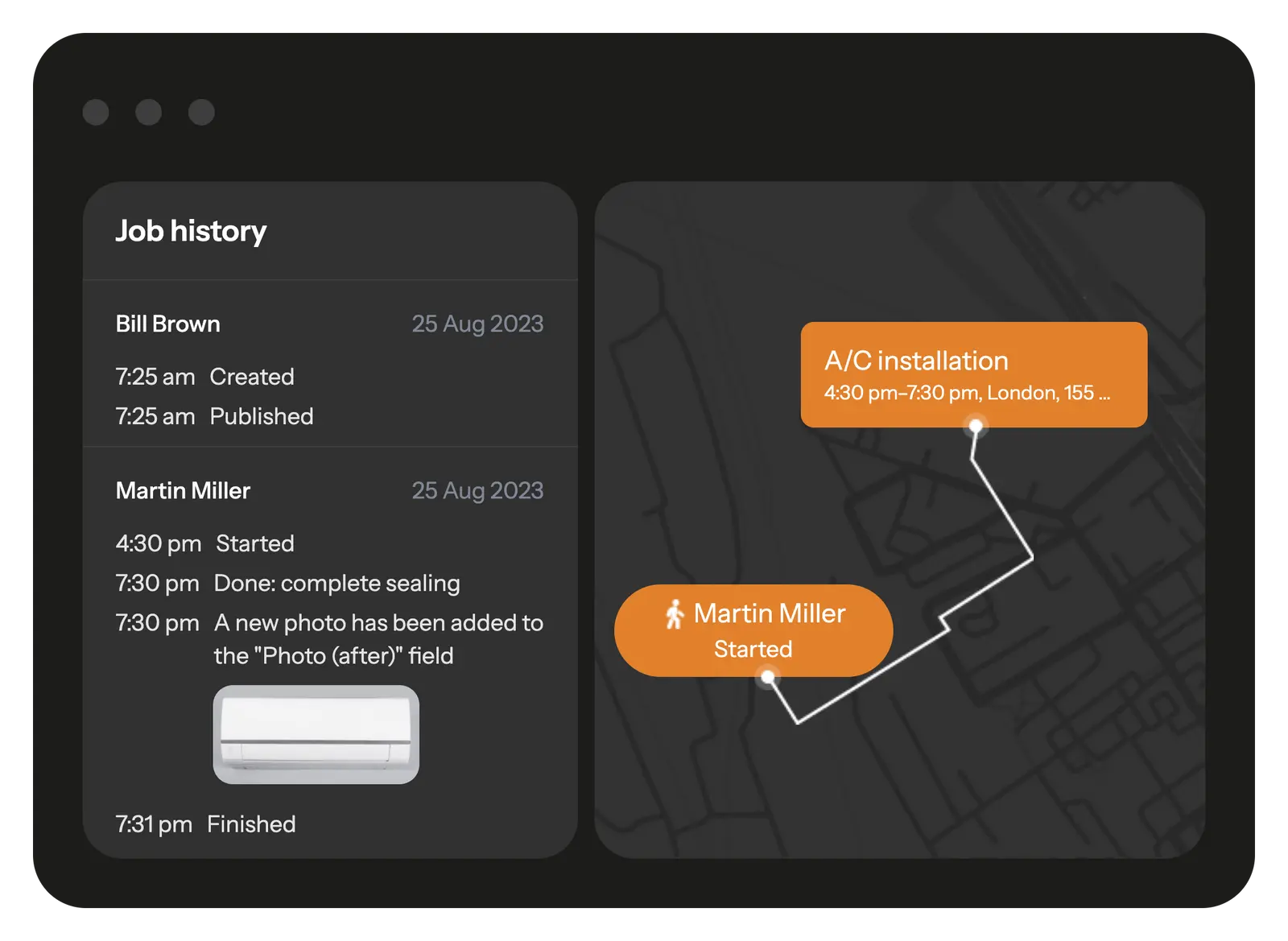 Track your workers' trip during working hours, schedule jobs to your workers based on their location right on the map.
