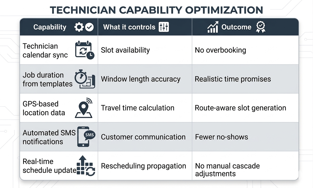 Scheduling time windows are generated from technician calendar data, estimated job duration, and travel time between locations. As jobs are added or completed, remaining slots recalculate automatically to reflect current availability rather than the original plan.