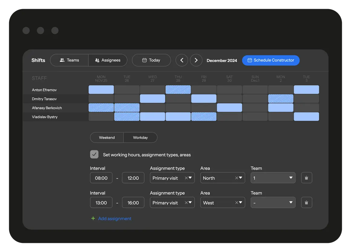 You can manually or automatically set a schedule for each employee or team—assign days off and work shifts, lunch breaks, etc. This will simplify team planning and allow you to optimize task assignment.