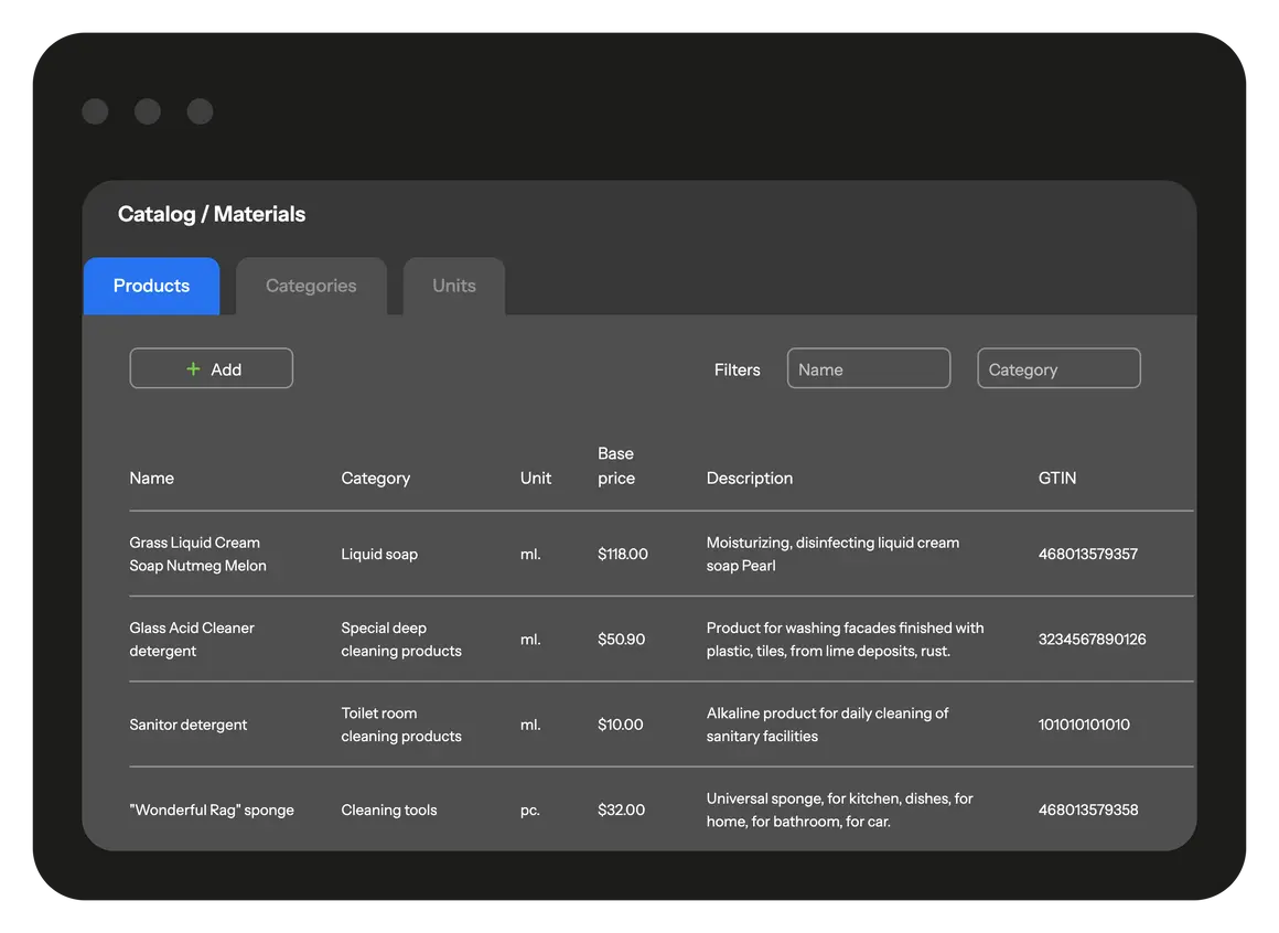 Keep track of services rendered, goods sold, and materials used. Once the order is complete, they are automatically calculated and sent to the office. Monitor material consumption and warehouse stock levels.