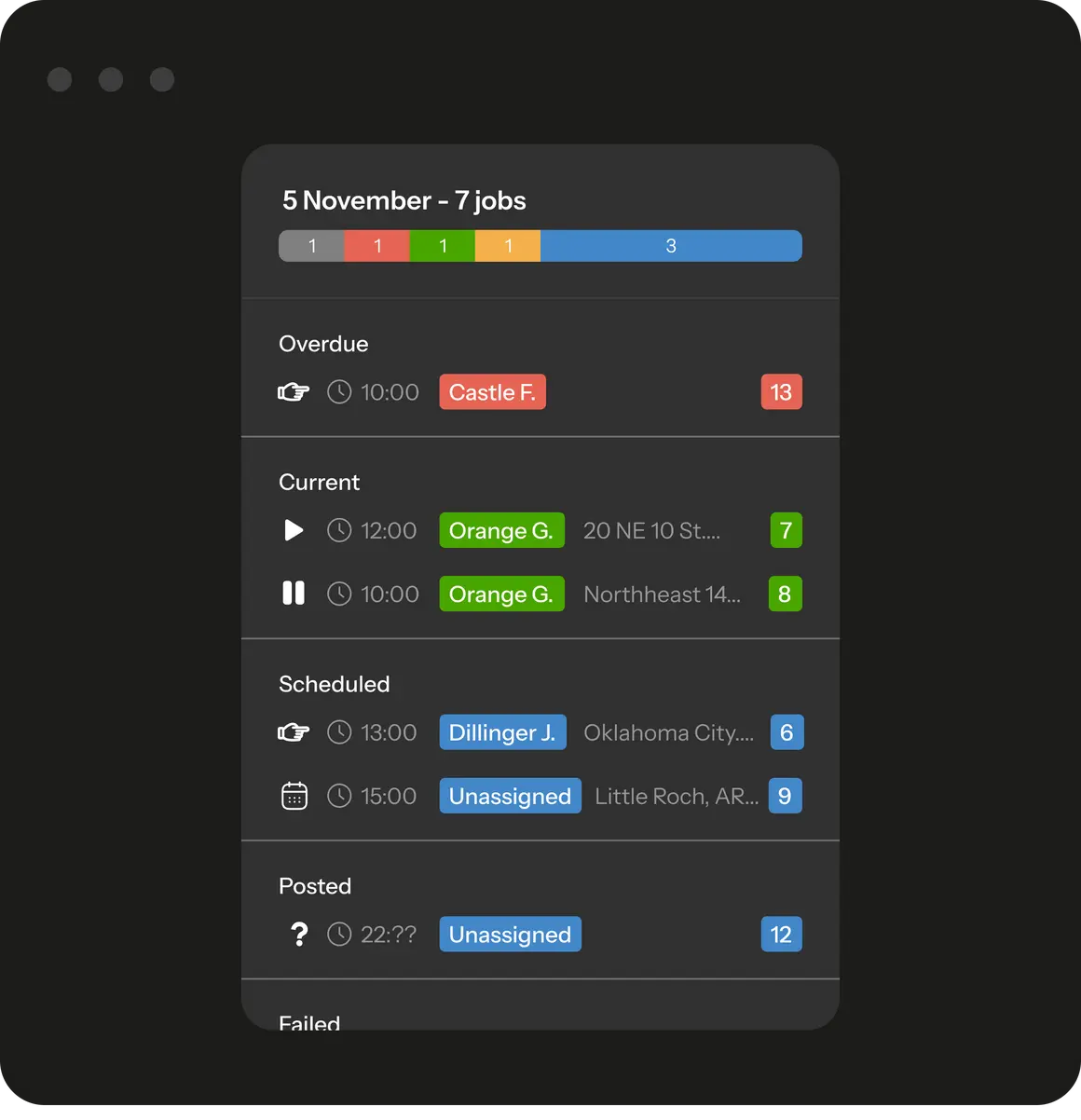 Office teams see job statuses such as En Route, Started, Delayed, and Completed. This visibility removes guesswork and allows quick decisions when something goes off schedule.