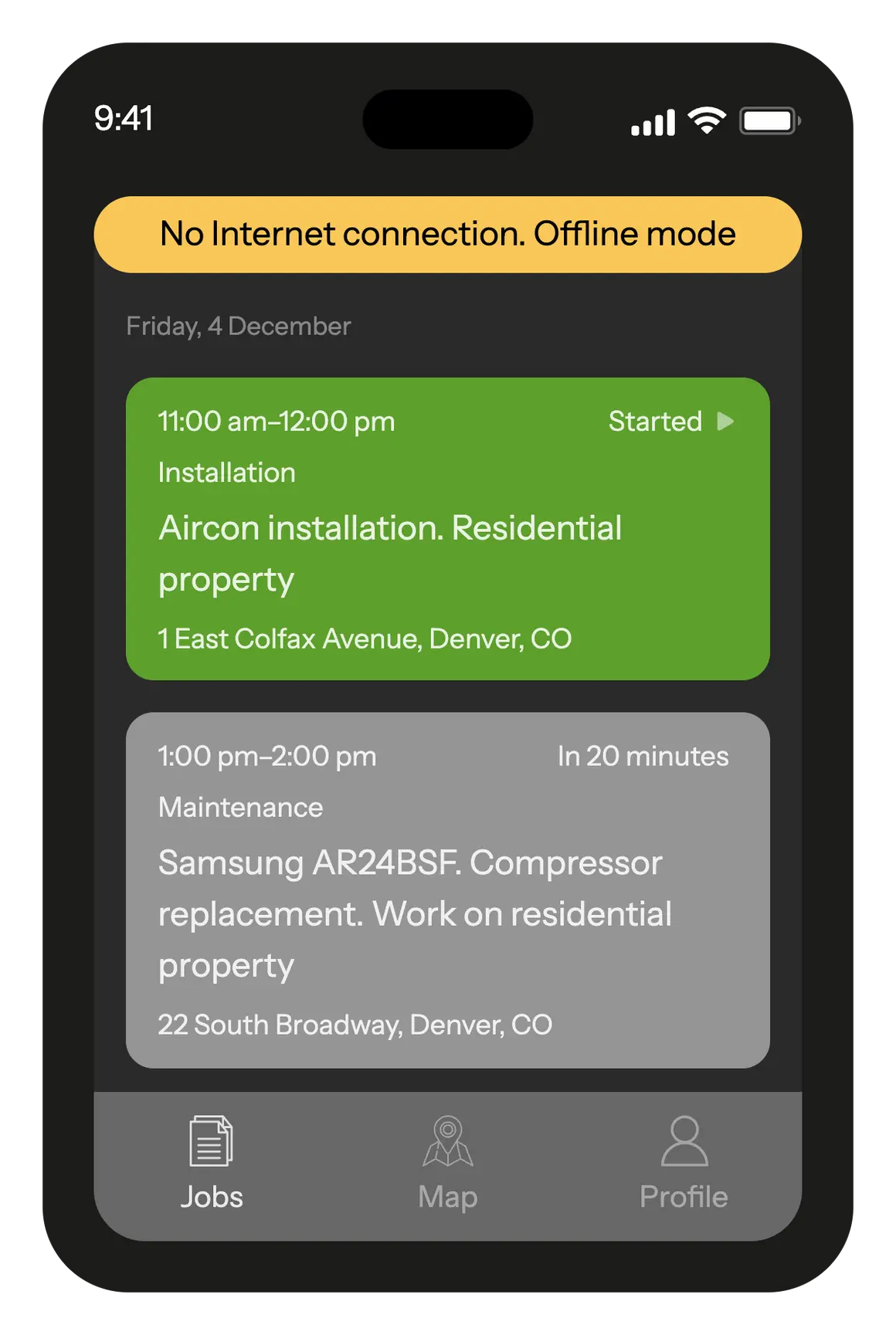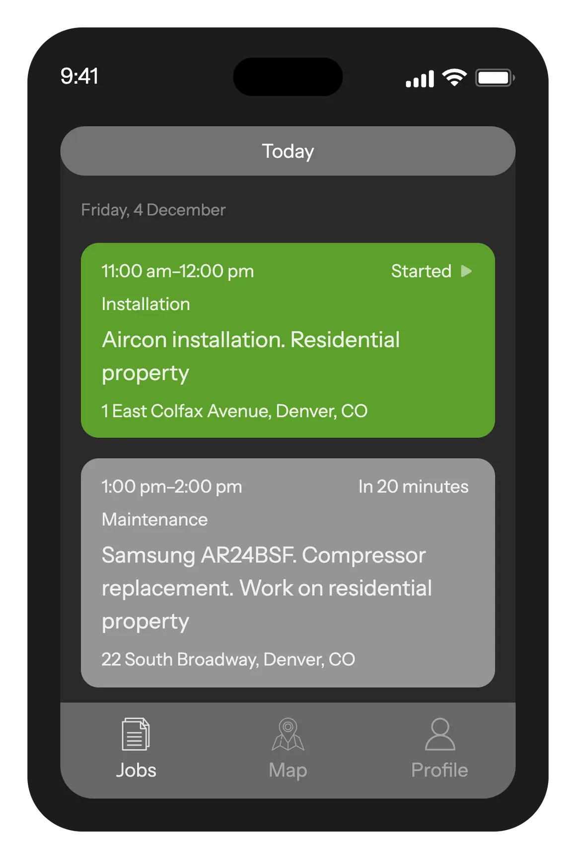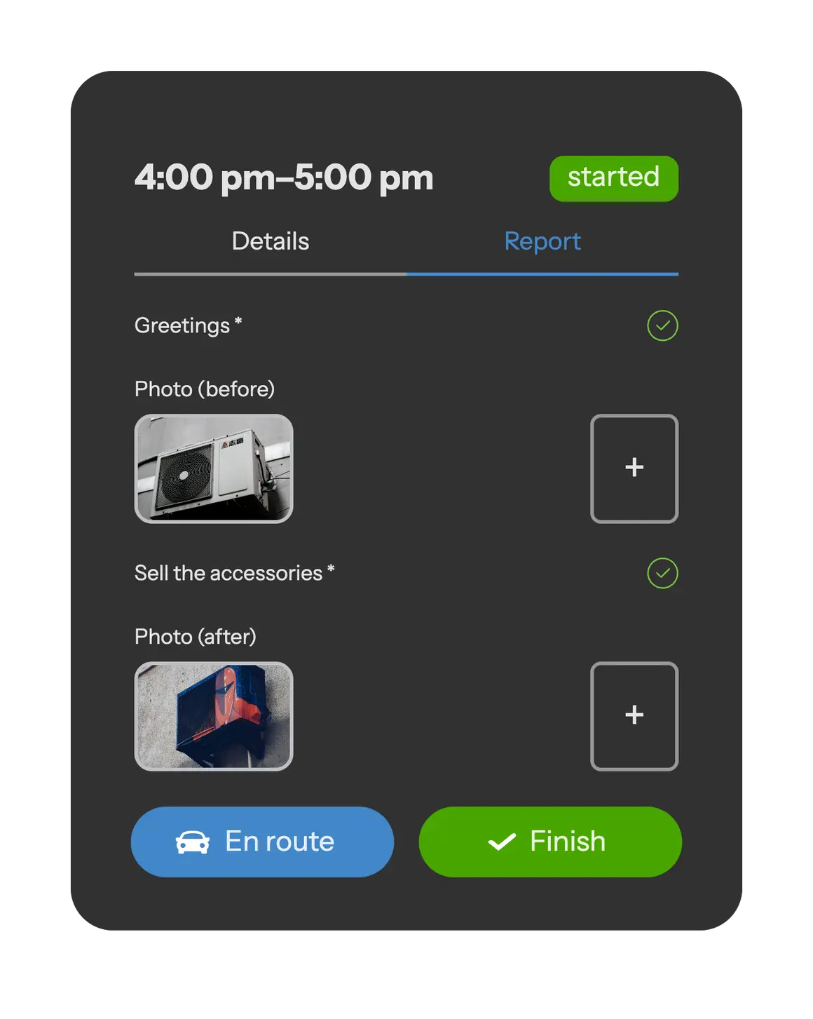 Ensure you mark each action as completed in the app. This enables the dispatcher to immediately know your status: whether you are en route to the client's premises, have started working, or have completed the job. This ensures constant communication between you and the office, allowing for more efficient organization of your work.