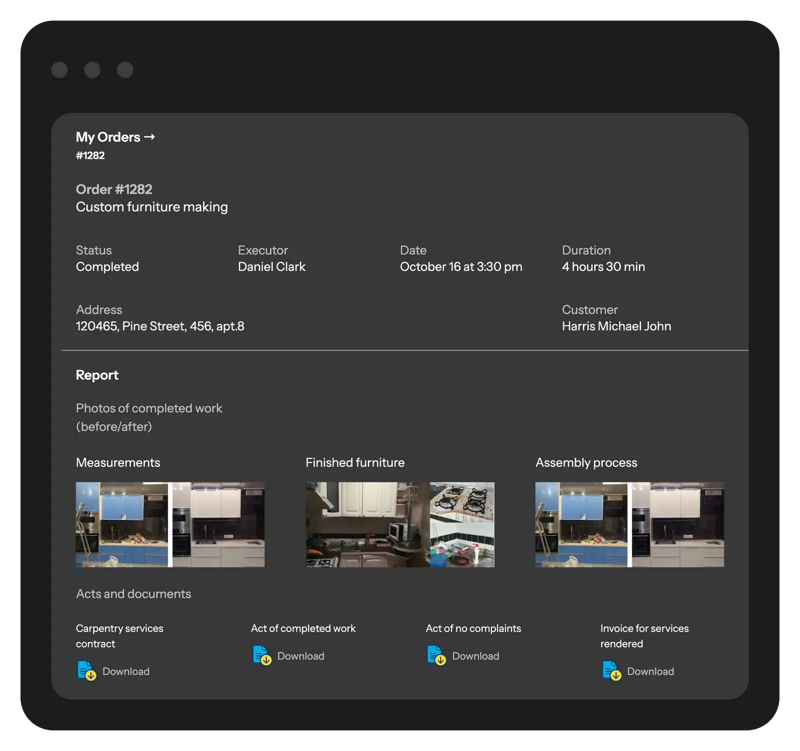 Share a branded portal with clients, giving them full transparency into ongoing and completed projects, work stages, photo reports, and documents.