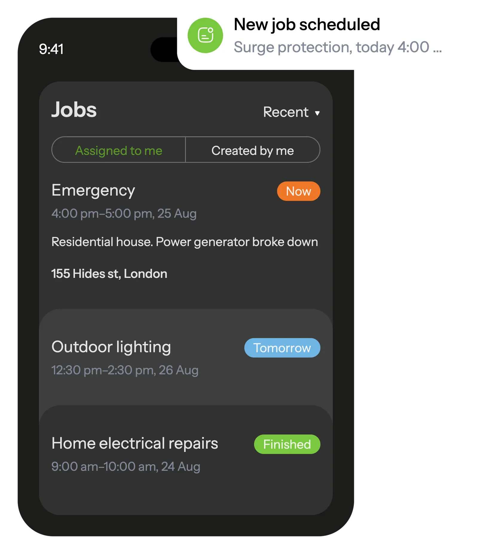The mobile app keeps electricians informed about scheduled tasks and updates them with new assignments via notifications.