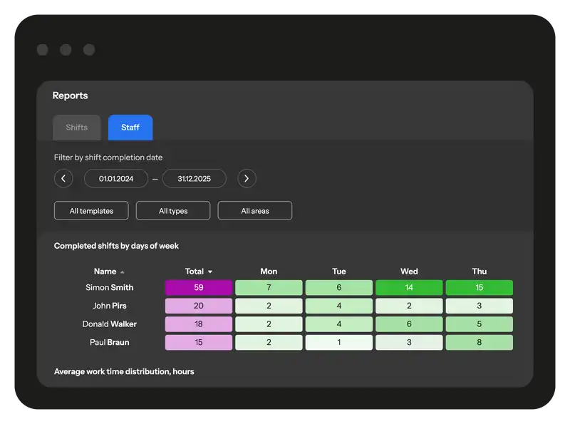 The Reports dashboard provides detailed statistics on every job and every technician. Evaluate completed and scheduled work, identify reasons for missed tasks, and measure individual performance — all in one place.