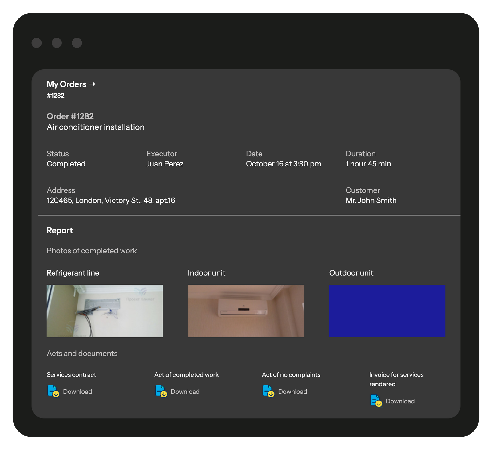 Upon completing a task, the technician submits a detailed, customizable report including photos, which is automatically saved to the database and shared with the office.