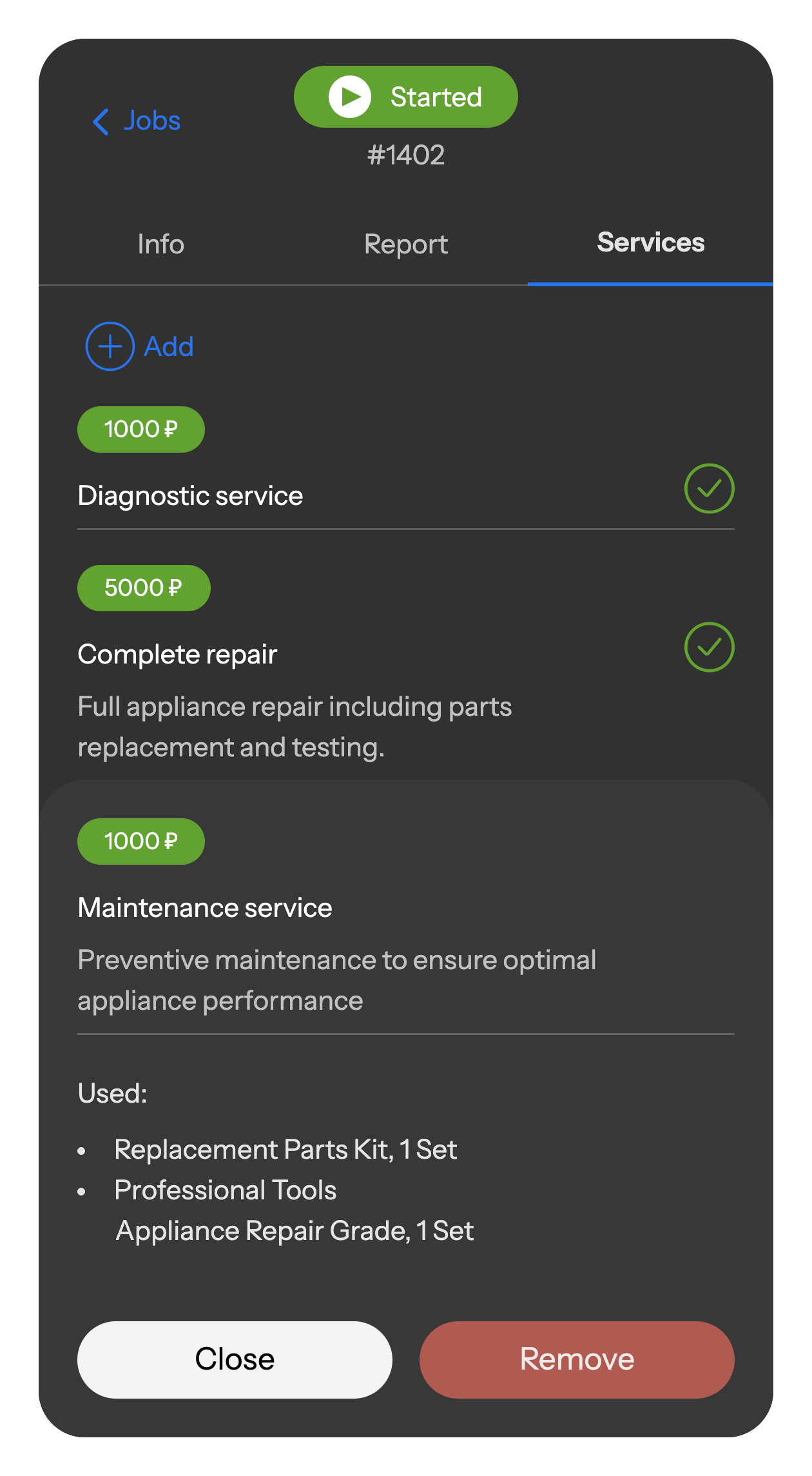 The employee records all completed work and materials used in the mobile app, which are saved in the report and automatically transferred to the office and warehouse.