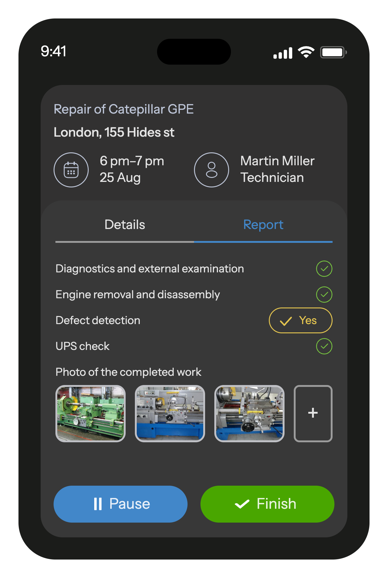 Upon completion of the work, the employee fills out a customizable report with photos and other data, which is instantly saved and sent to the office.