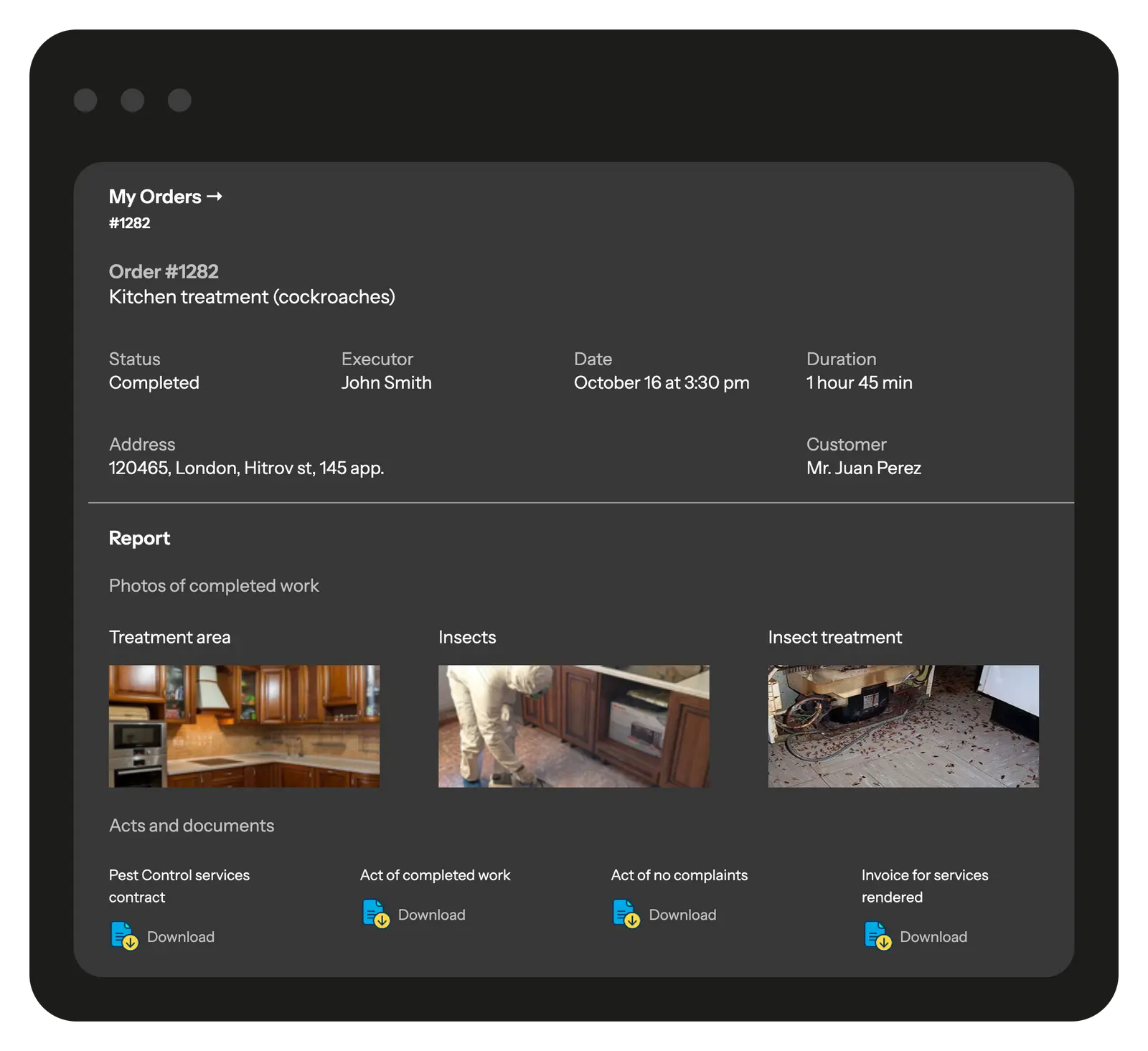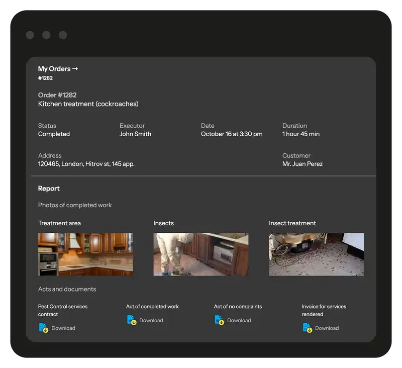 Give your clients access to a branded portal with detailed information on service requests, job statuses, and photo reports from completed treatments.