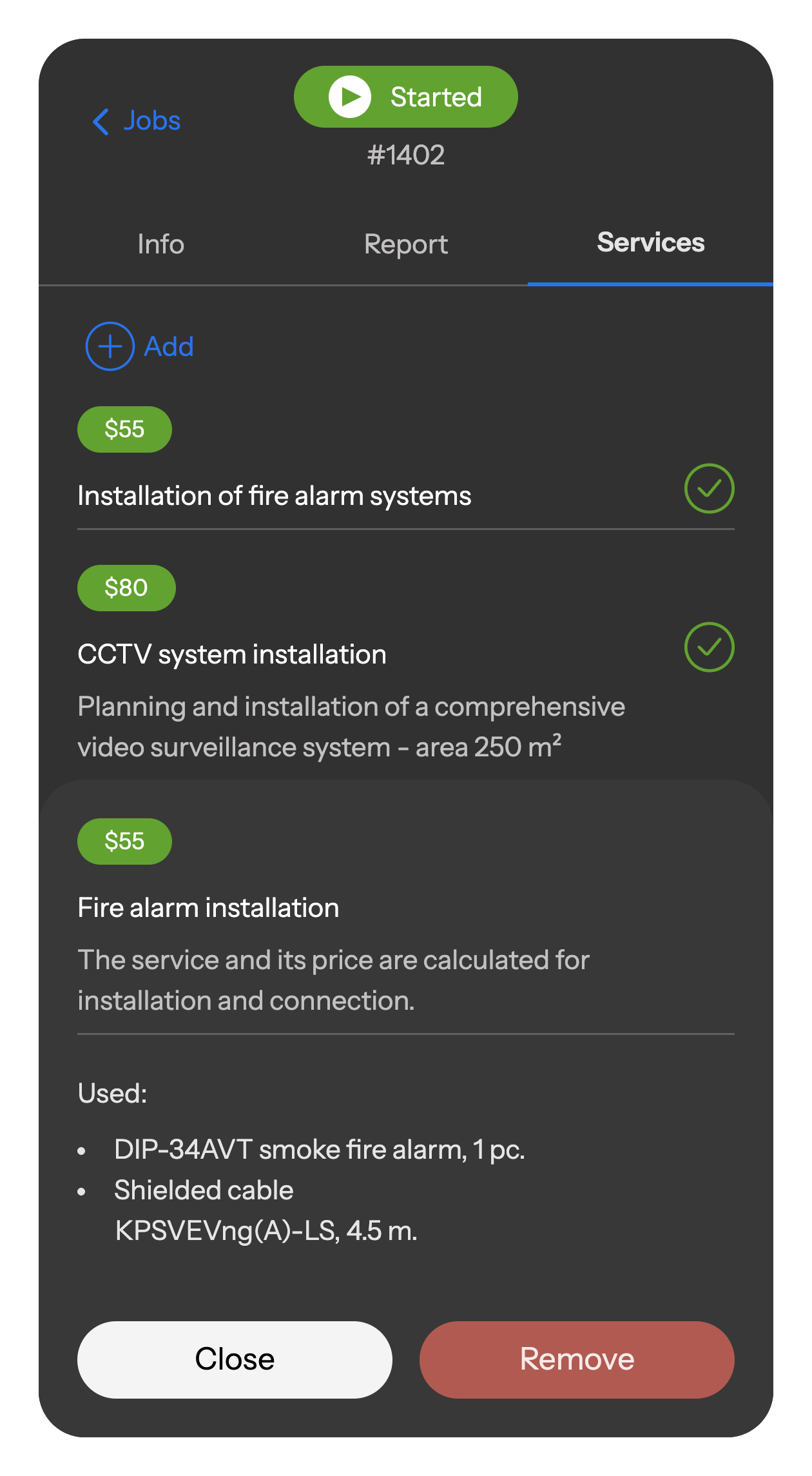 The specialist records all services rendered and materials used in the mobile application, which are automatically calculated, saved in the report, and sent to the office and warehouse.